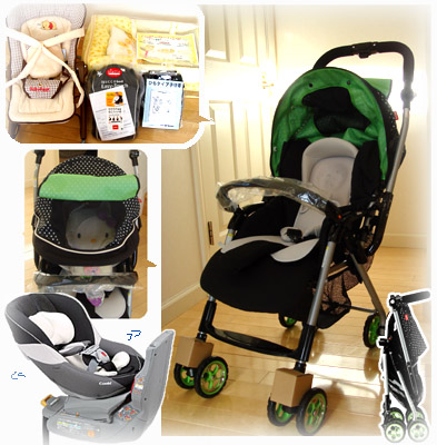 【ベビーカー】は、ママと一目ぼれした【アップリカのA型】(^ω^)フードが激カワ!(画像左中央参照)その何ともいえない愛らしい(?)フォルムに大笑いしながら即購入決定。機能もちゃんとしてて、片手でパッと開閉できるし、軽いし、小回りも効くのでお気に入りです。出動が待ち遠しい!