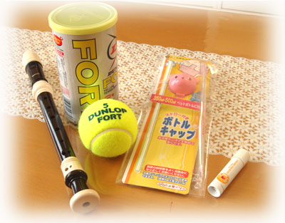 右から、リップクリーム・ペットボトル用のストロー・テニスボール(そして個人的にリコーダww)